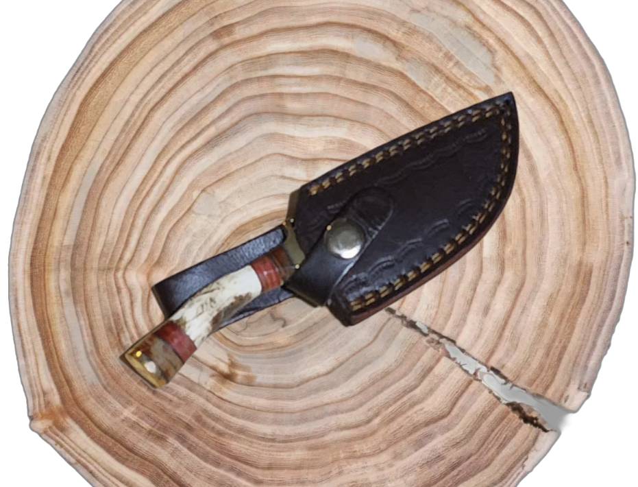 Damascus Steel Hunting Knife with Camel Bone Handle and Leather Sheath