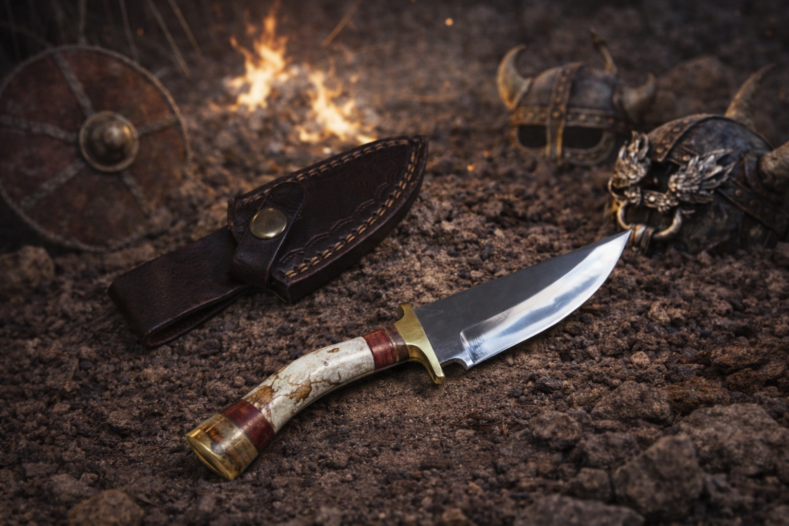 Handcrafted Viking Utility Knife with Antler Handle and Leather Sheath